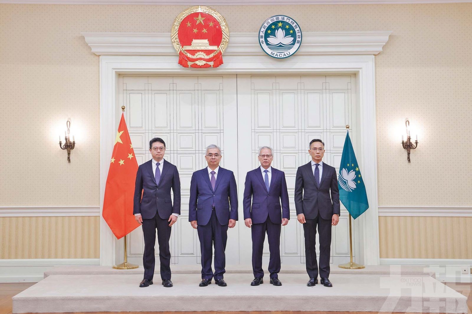 行政长官岑浩辉与新任行政法务司司长黄少泽、新任保安司司长陈子劲、新任检察院检察长唐晓峰合影。 (新闻局图片)